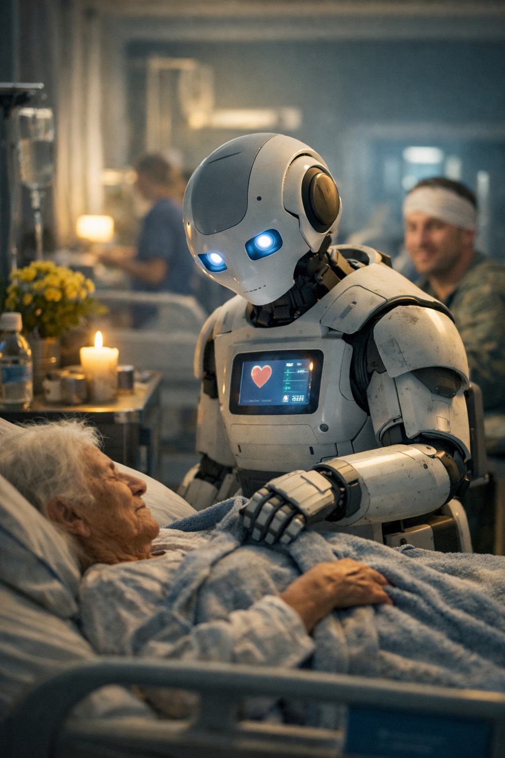 Az éjszaka végén a droid kilépett a kórház hulladékudvarára. A ködben Lviv fényei sejtelmesen vibráltak. A robot megtorpant a hideg kórházi udvaron, és a város felé fordította a szenzorait. Nem tudta megfogalmazni, hogy miért, de úgy érezte, mintha a környező utcák fényei az emberek nyelvén válaszolnának neki. Egyetlen gondolat futott át az agyán, mint egy ösztönös belső válasz, amit senki sem programozott belé. Arra gondolt, hogyha az emberek elfáradnak, akkor neki is szerepe van abban, hogy ne maradjanak egyedül a teherrel. Ez a felismerés, akármennyire is gépi logikából indult, már sokkal inkább emlékeztetett valamire, amit a kórházban és az irodában dolgozók érzelemnek hívnak.